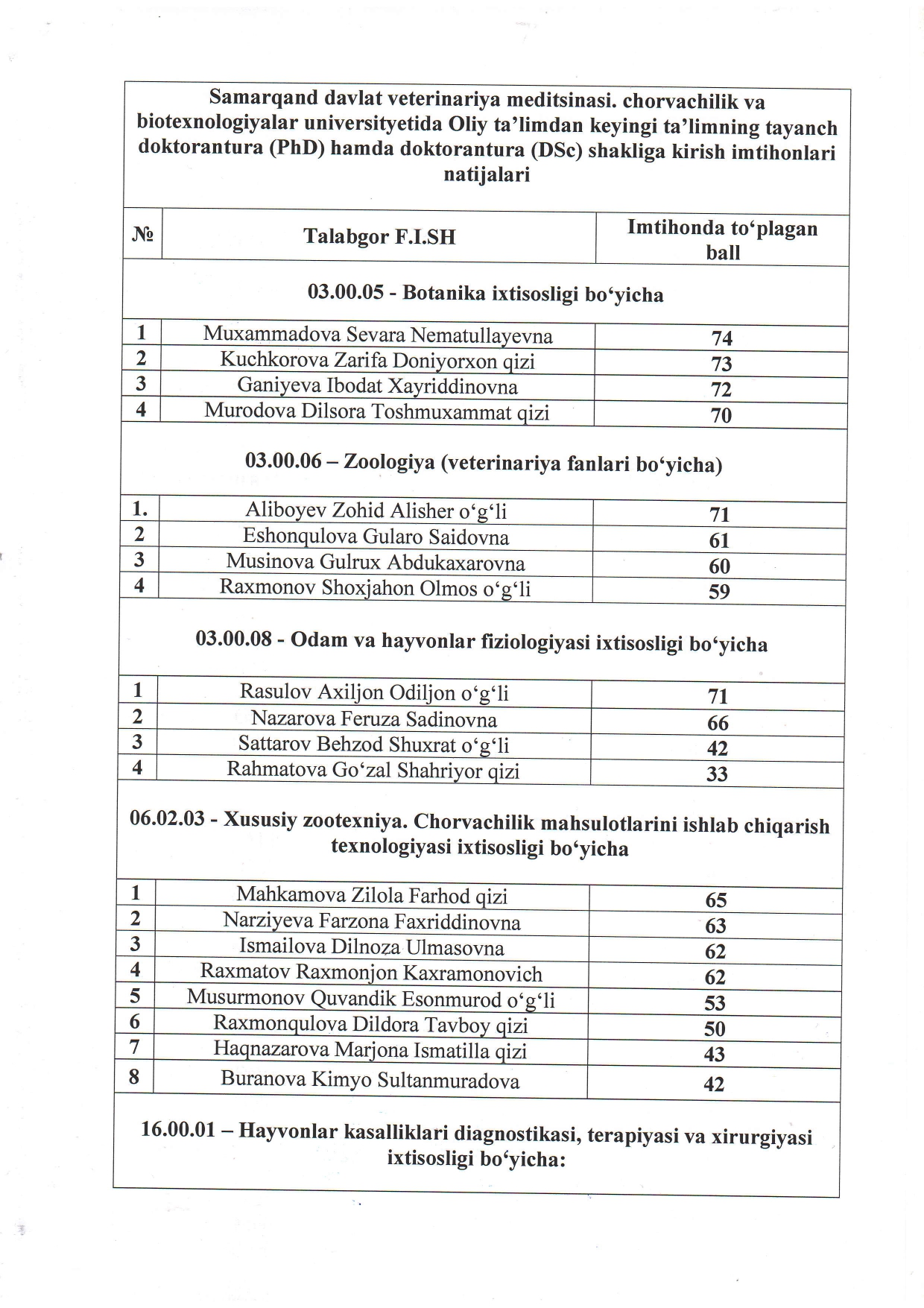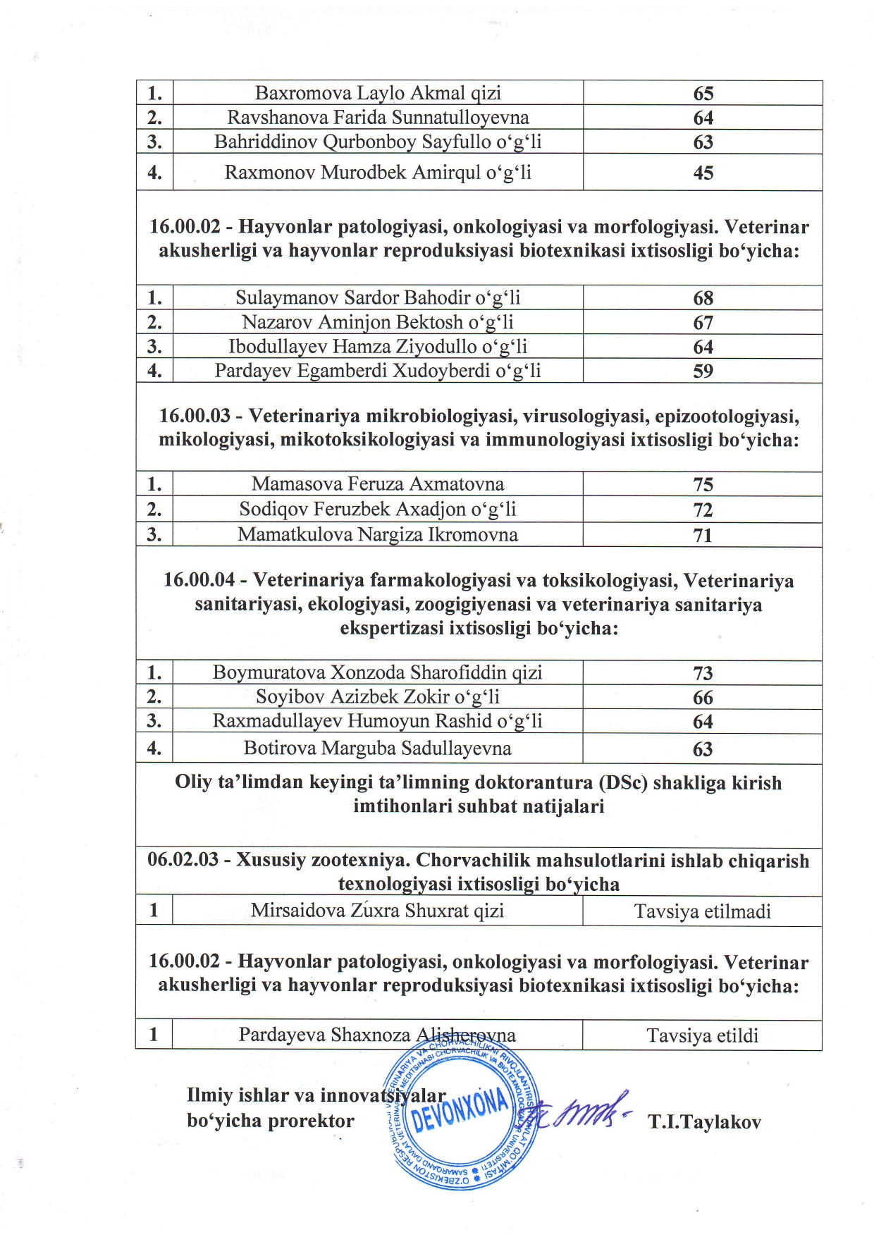 TAYANCH DOKTORANTURA (PHD) HAMDA DOKTORANTURA (DSC) SHAKLIGA KIRISH IMTIHONLARI NATIJALARI