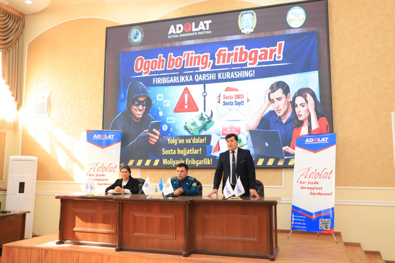 Tadbirda “Adolat” sosial-demokratik partiyasi viloyat kengashi raisi o'rinbosari A.Xoliqov, viloyat IIB Kibr xavfsizlik boshqarma boshlig'i o'rinbosari, kapitan J.Nuraliyev hamda viloyat Adliya boshqarmasi mas'ul xodimi N.Fayziyevalar ishtirok etib, aholi ayniqsa, yoshlar o‘rtasida huquqiy savodxonlikni oshirish, internet orqali tarqaladigan firibgarlik holatlari haqida ogohlantirish va ularning oldini olish haqida so'z yuritdi.