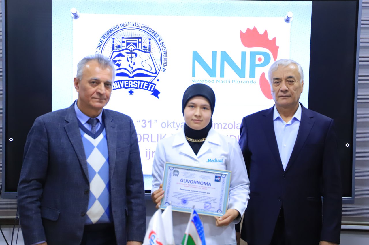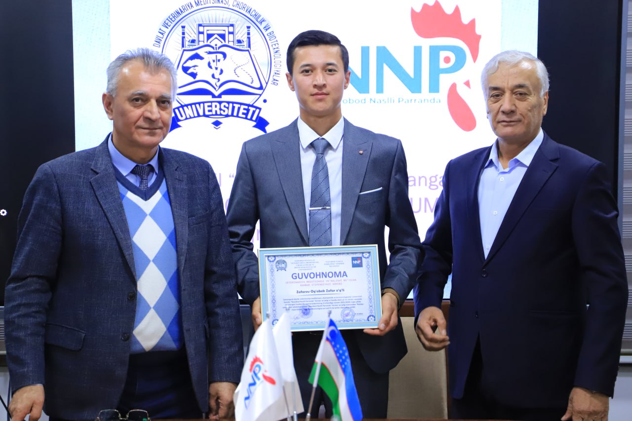 The “Leader Scholarship” was introduced between SamSUVMLB and the “Navobod Naslli Parranda” farm in the 2025/2026 academic year. Students in the “Veterinary Medicine”, “Zooengineering” and “Agrotechnology” departments won the competition. The winners were awarded certificates at the event. The main goal is to support talented students and train qualified specialists in the field.