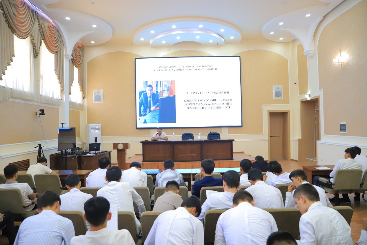 SamDVMCHBU Korrupsiyaga qarshi kurashish “Komplayens nazorat” tizimini boshqarish boʻlimi tomonidan ‘‘Korrupsiyaga qarshi kurashish hammamizning burchimiz’’ mavzusida Veterinariya profilaktikasi va davolash fakulteti 1-bosqich talabalari bilan davra suhbati o‘tkazildi