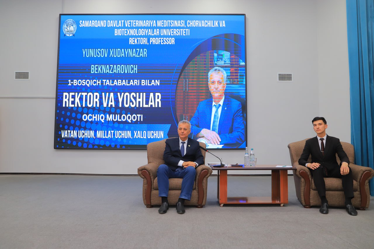 Bugun universitet “Madaniyat saroyi”da SamDVMCHBU rektori, professor Xudaynazar Yunusovning Veterinariya profilaktikasi va davolash, Veterinariya diagnostikasi va oziq-ovqat xavfsizligi hamda Chorvachilik va texnologiyalar fakultetlarining 1-bosqich talabalari bilan ochiq muloqot uchrashuvi bo‘lib o‘tdi.