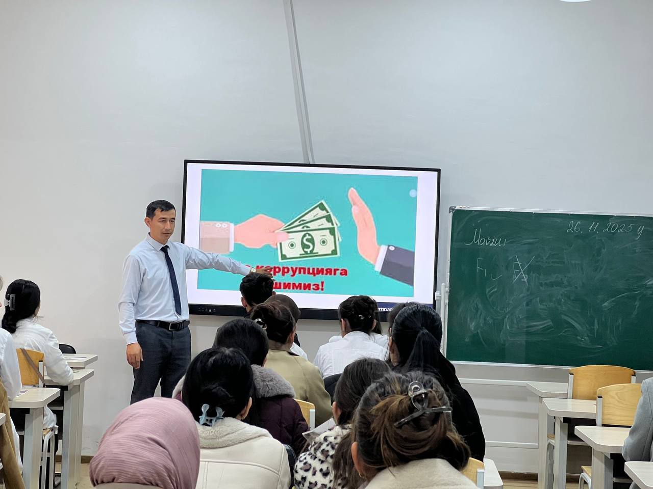 “Biz korrupsiyasiz kelajak quramiz” shiori ostida tashkil etilgan ushbu suhbat talabalarda halollik madaniyatini mustahkamlashga, adolatli va porloq kelajak sari dadil qadam tashlashiga xizmat qildi.