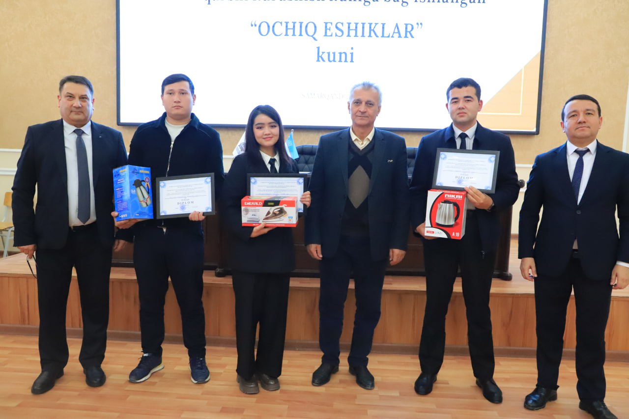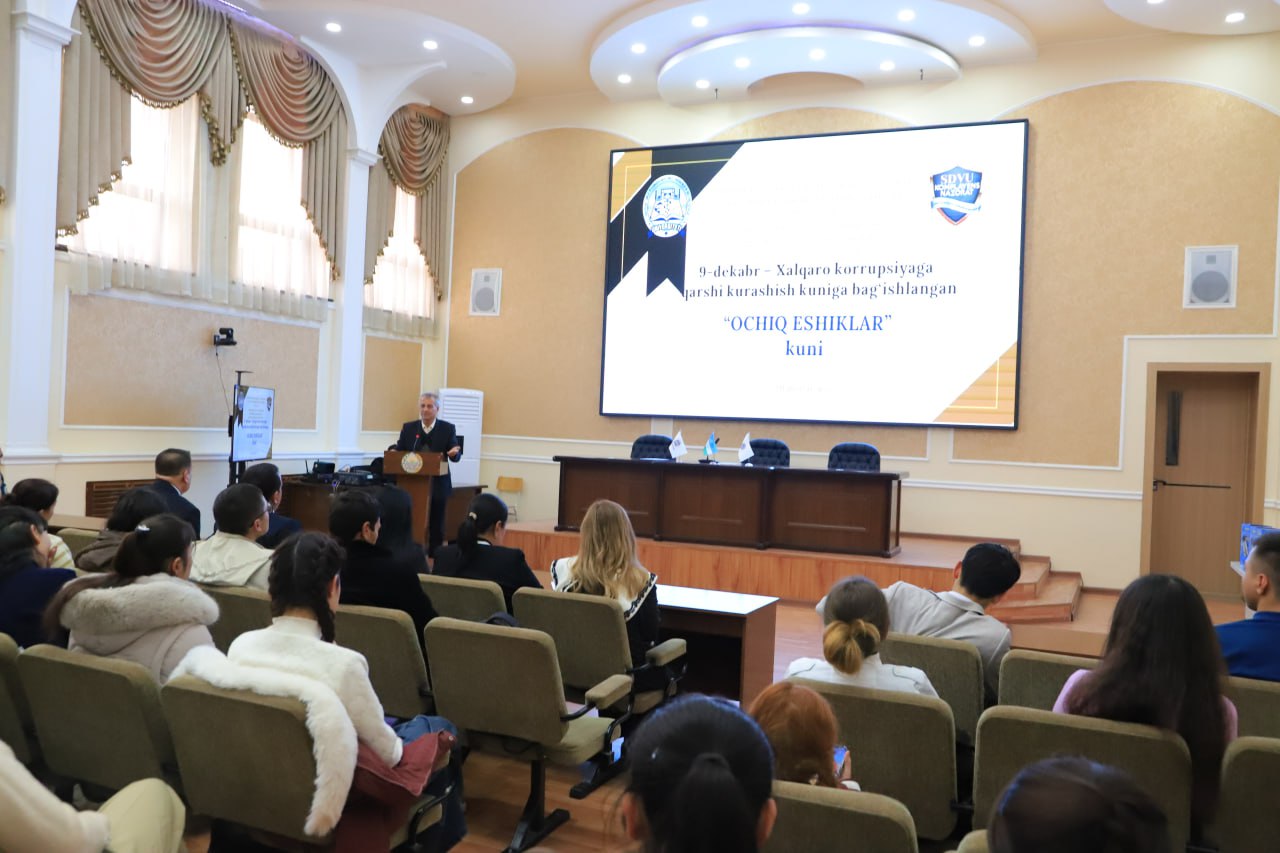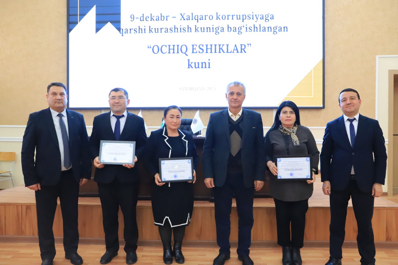 Tadbir davomida universitetda 9-dekabr - Xalqaro korrupsiyaga qarshi kurashish kuni munosabati bilan talabalar o‘rtasida o‘tkazilgan "Yoshlar korrupsiyaga yo‘q deydi" mavzusida "Eng yaxshi rasmlar" tanlovi hamda "Korrupsiyaga qarshi birgalikda kurashamiz" mavzusida o‘tkazilgan insholar tanlovi g‘oliblari universitet rahbariyati tomonidan faxriy yorliq va esdalik sovg‘alari taqdirlandi.