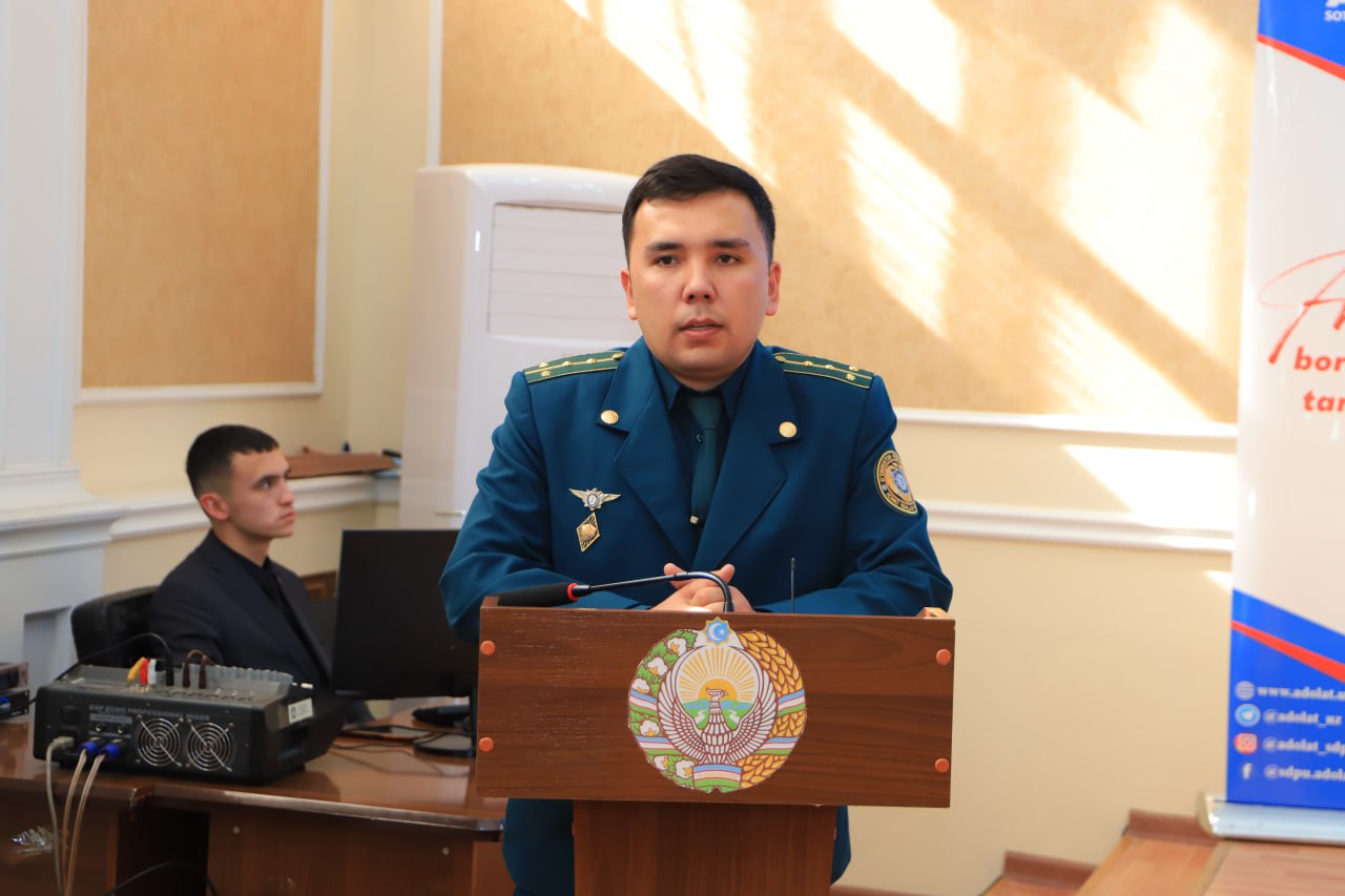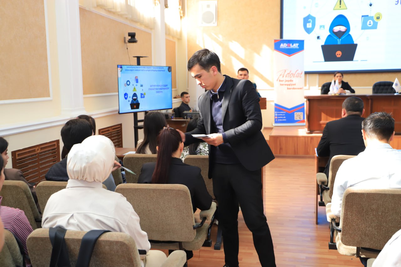 Tadbirda “Adolat” sosial-demokratik partiyasi viloyat kengashi raisi o'rinbosari A.Xoliqov, viloyat IIB Kibr xavfsizlik boshqarma boshlig'i o'rinbosari, kapitan J.Nuraliyev hamda viloyat Adliya boshqarmasi mas'ul xodimi N.Fayziyevalar ishtirok etib, aholi ayniqsa, yoshlar o‘rtasida huquqiy savodxonlikni oshirish, internet orqali tarqaladigan firibgarlik holatlari haqida ogohlantirish va ularning oldini olish haqida so'z yuritdi.